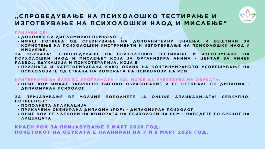 Вера Димовска anima.centar@gmail.com или на телефон 070 549 205